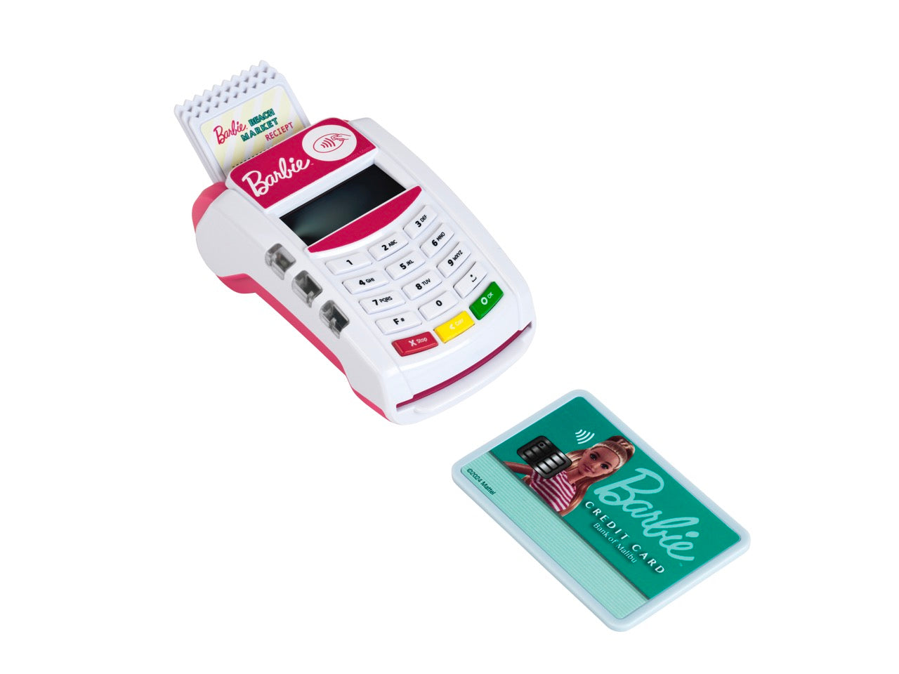 Moderní doba přebírá vládu nad světem Barbie: s tímto platebním terminálem v elegantním designu Barbie mohou nyní milovníci panenek všech věkových kategorií nakupovat stylově pomocí skvělé kreditní karty, aniž by se museli obtěžovat zadáváním kódu nebo PIN. Jednoduše zapnou čtečku karet a když prostrčí kreditní kartu štěrbinou nebo podrží kartu Barbie nad nápisem bezkontaktní platby, moderní terminál příslušným zvukem oznámí, že karta byla přečtena a přijata. Poté vystaví doklad o nákupu, jako skutečný doklad z pokladny. Takto promění dětský obchod v elegantní Barbie butik.
