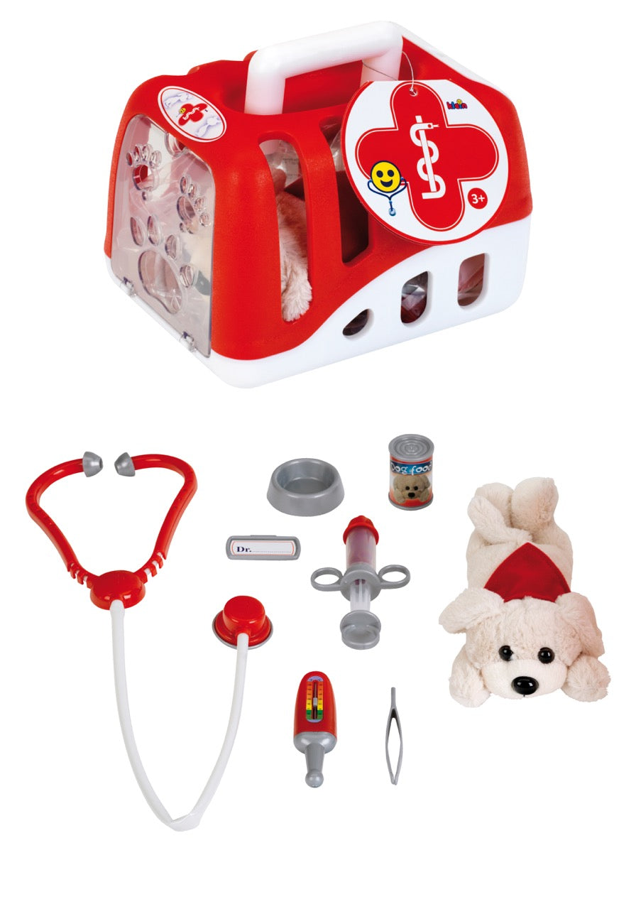Tento pevný transportní kufřík s praktickou rukojetí obsahuje roztomilého plyšového pejska a jeho misku a také kompletní sadu veterinárních nástrojů: stetoskop, injekční stříkačku, teploměr, pinzetu, jmenovku a plechovku.