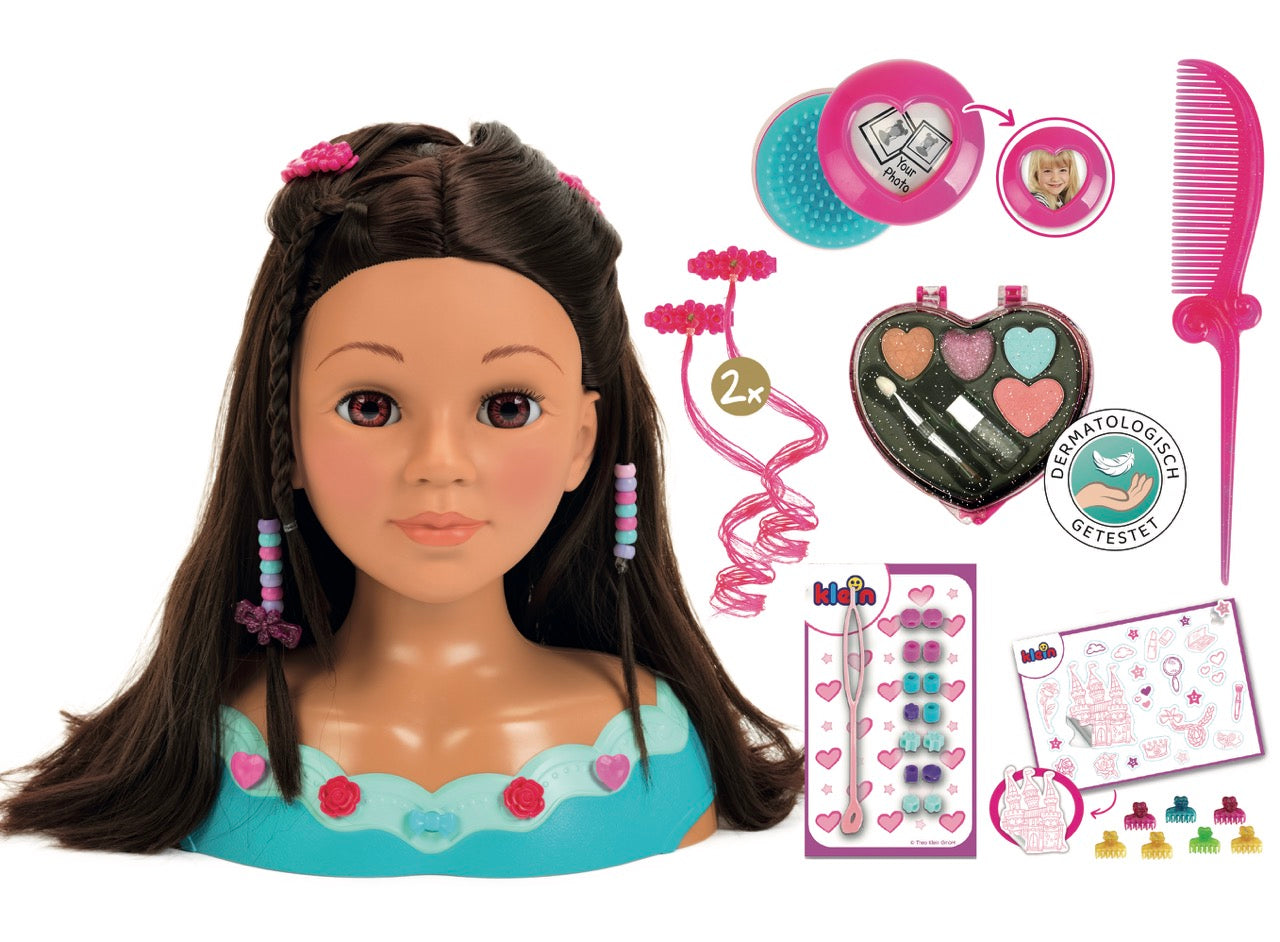 Make-up and Hairdressing Head 'Mia' Krásná, 27 cm vysoká hlava stylisty pro děti s omyvatelnými a rozčesatelnými vlasy, včetně dermatologicky testované kosmetické sady ve tvaru srdce a vlasových doplňků. Kosmetické srdce obsahuje lesk na rty, oční stíny a tvářenku. Vlasové doplňky a nástroje pro úpravu vlasů zahrnují kartáč, hřeben, dva prameny vlasů, sadu vlasových korálků, sedm vlásenek, dvě sponky do vlasů, osm ozdobných jehel na tělo a sponky do vlasů, stejně jako arch se samolepkami, návod s tipy na styling a mnoho dalšího.
