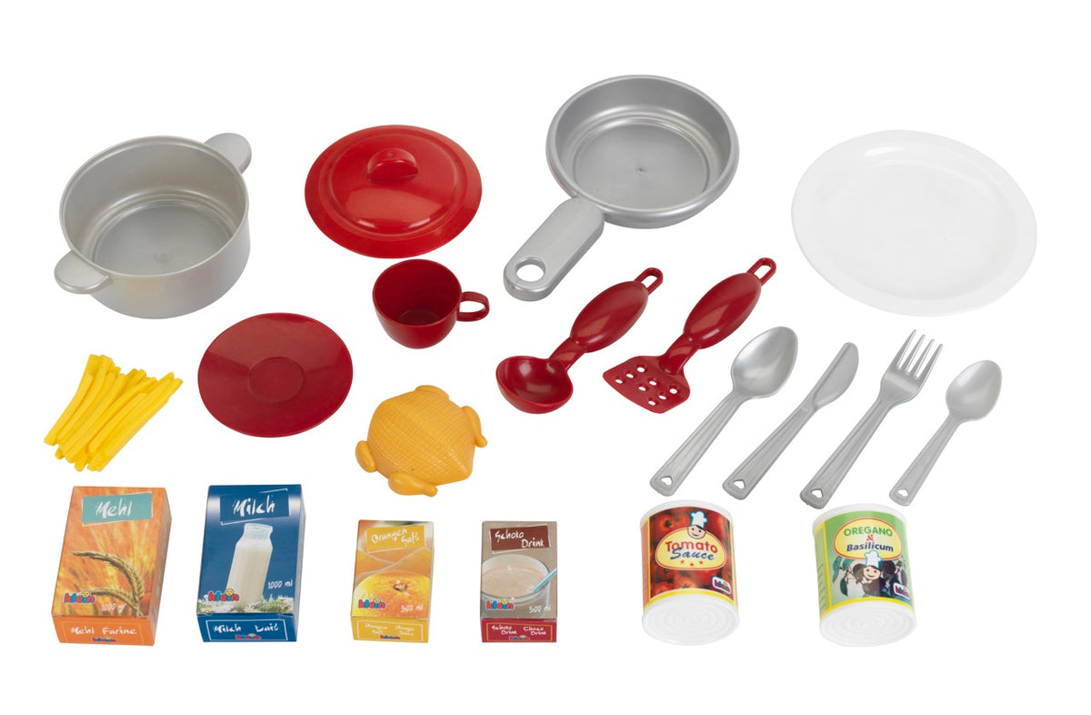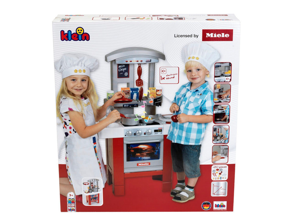 Miele „startovací“ kuchyňka Dětská kuchyňka na hraní v designu Miele, kterou lze hrát z obou stran, potěší malé milovníky vaření zvukovým modulem s elektronickými zvuky vaření, četnými možnostmi hraní a spoustou příslušenství. Patří sem trouba, myčka, digestoře, dřez a praktický úložný prostor. Součástí je také pánev, hrnec s poklicí a kuchyňské vybavení (stěrka, vařečka). Součástí jsou také příbory, jako jsou talíře, vidličky, nože, lžíce, šálek na espresso, podtácek a kávová lžička. A aby si malí kuchaři mohli připravit něco ve své fantazii, součástí jsou i repliky jídla: hranolky, půlka kuřete, čtyři balíčky jídla a dvě konzervy.