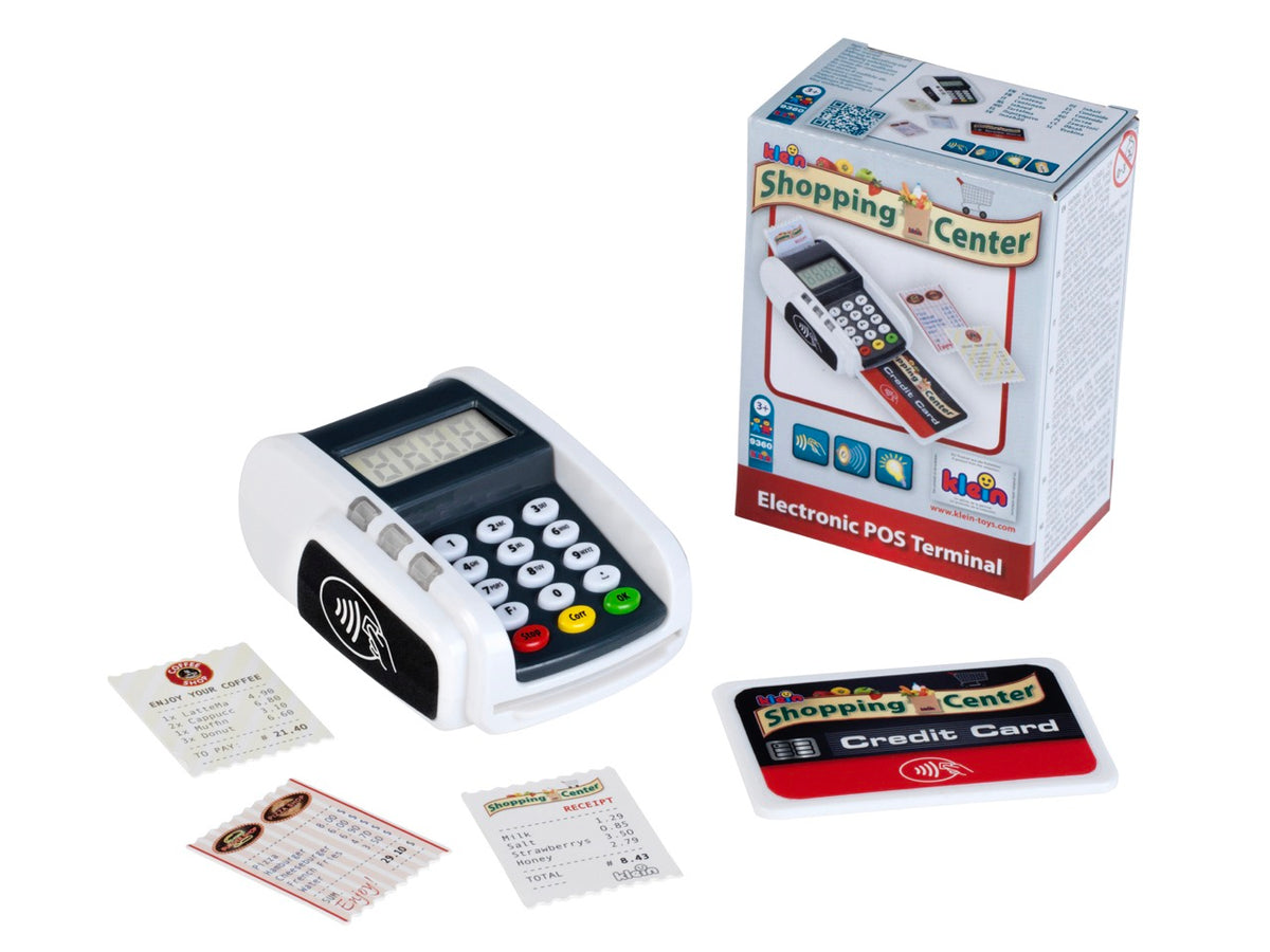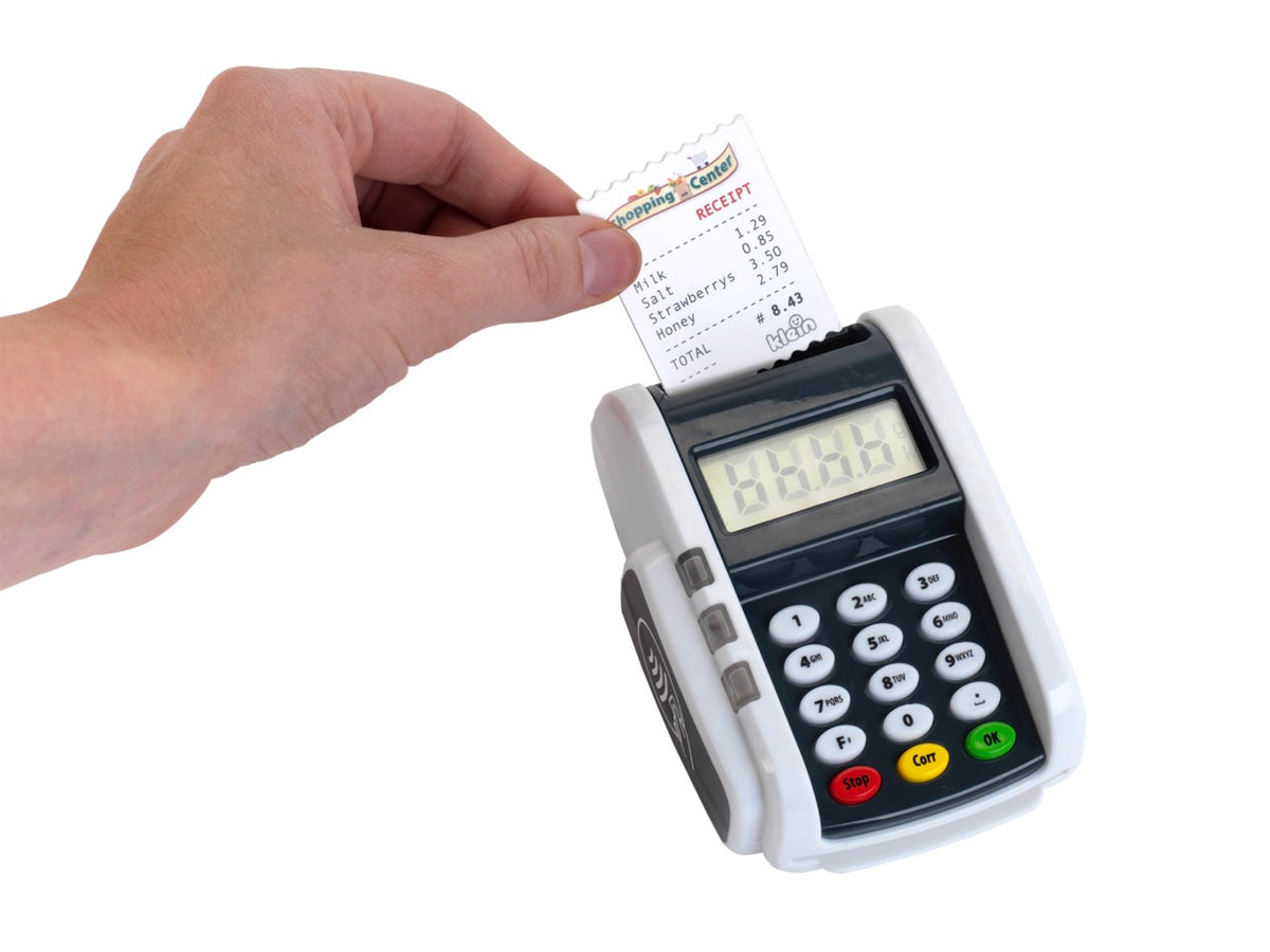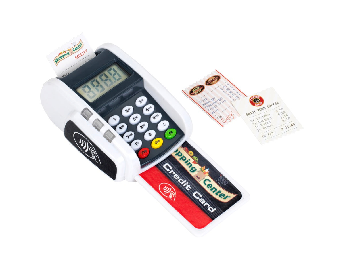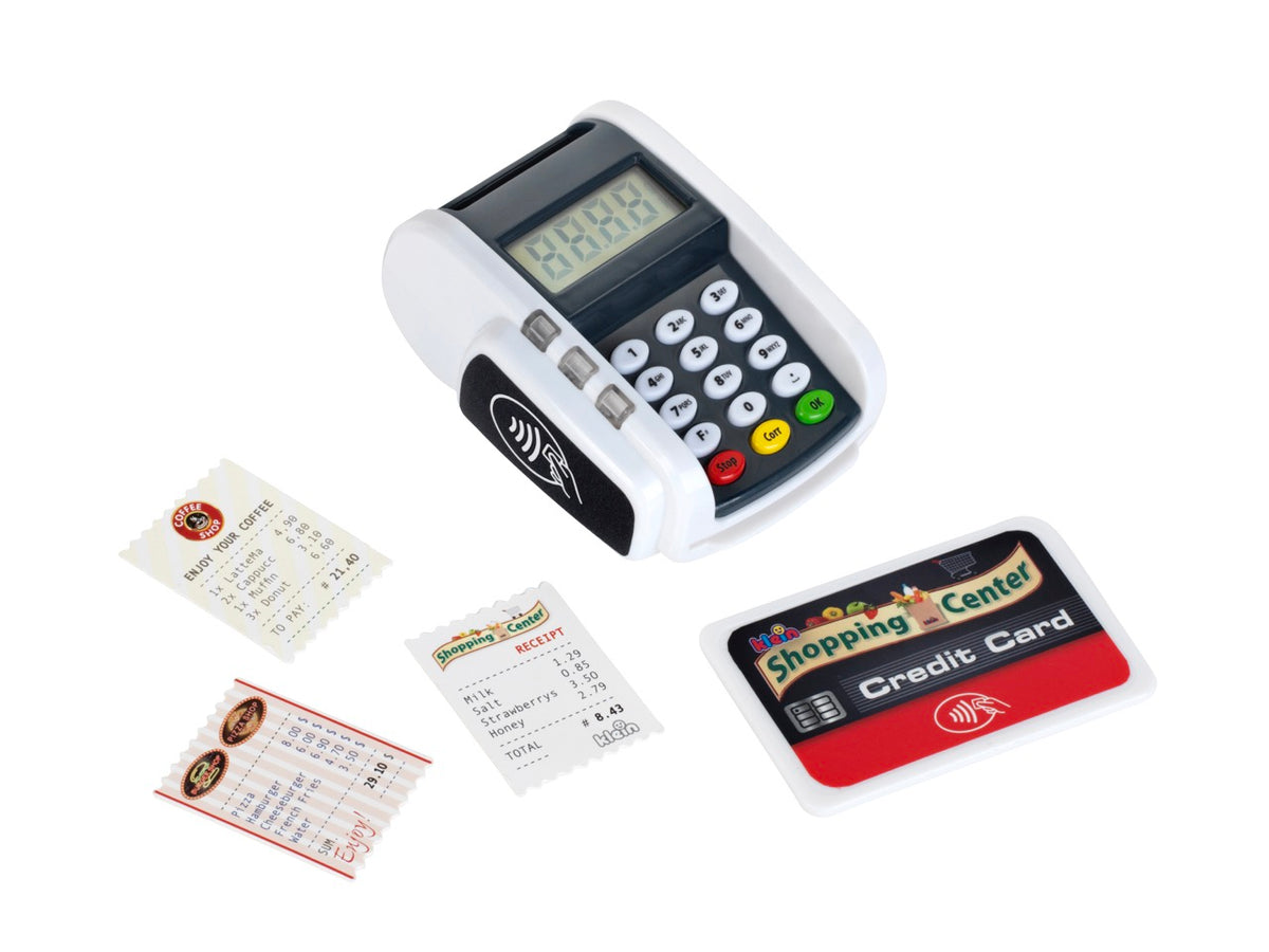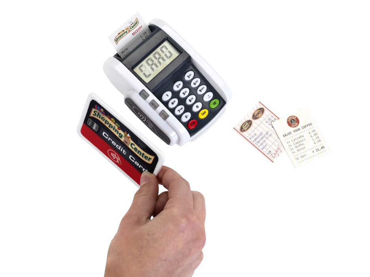 Takto se bude v budoucnu platit – kartami, moderním terminálem a spoustou zábavy. Platba probíhá kreditní kartou, která po vložení do terminálu vydává skutečné nákupní zvuky, nebo – bez přejetí prstem nebo dotykem – pomocí funkce bezkontaktní platby: stačí zadat částku, potvrdit, podržet kreditní kartu u terminálu, zadat PIN, potvrdit a platba je úspěšná. Zbývá tak více času na příjemné rozhovory se zákazníky o počasí, zboží a pohodě, což trénuje představivost a komunikační schopnosti malých pokladních.