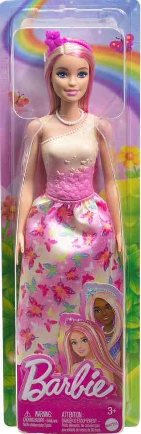 Panenka Barbie. Tato krásná, barevná panenka je jako z pohádky. Má dlouhé rozpuštěné vlasy, které se dají česat, top s ozdobnými květinami, vzorovanou sukni a boty na podpatku. Na hlavě nosí krásnou korunu s květinou. Skutečná princezna.