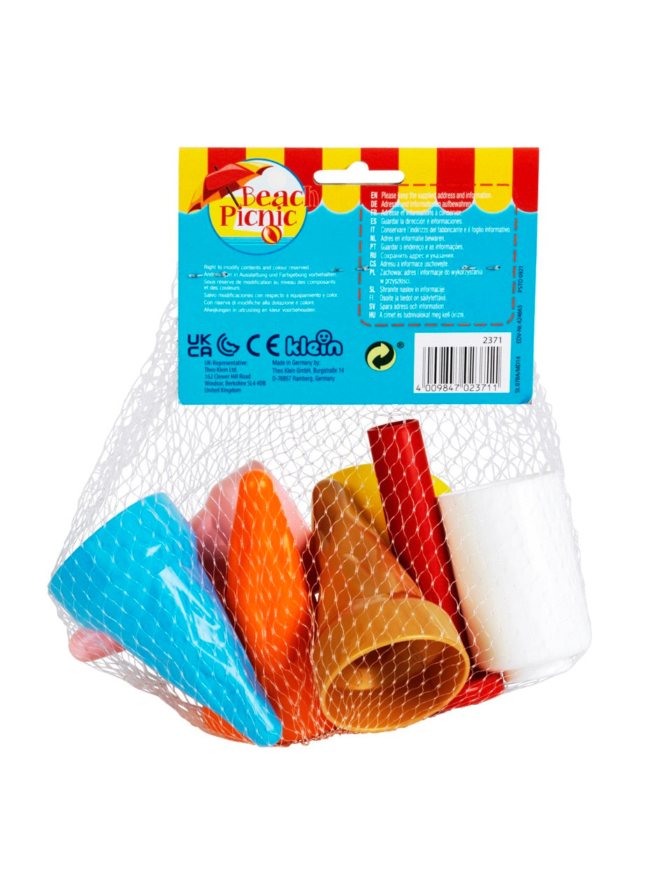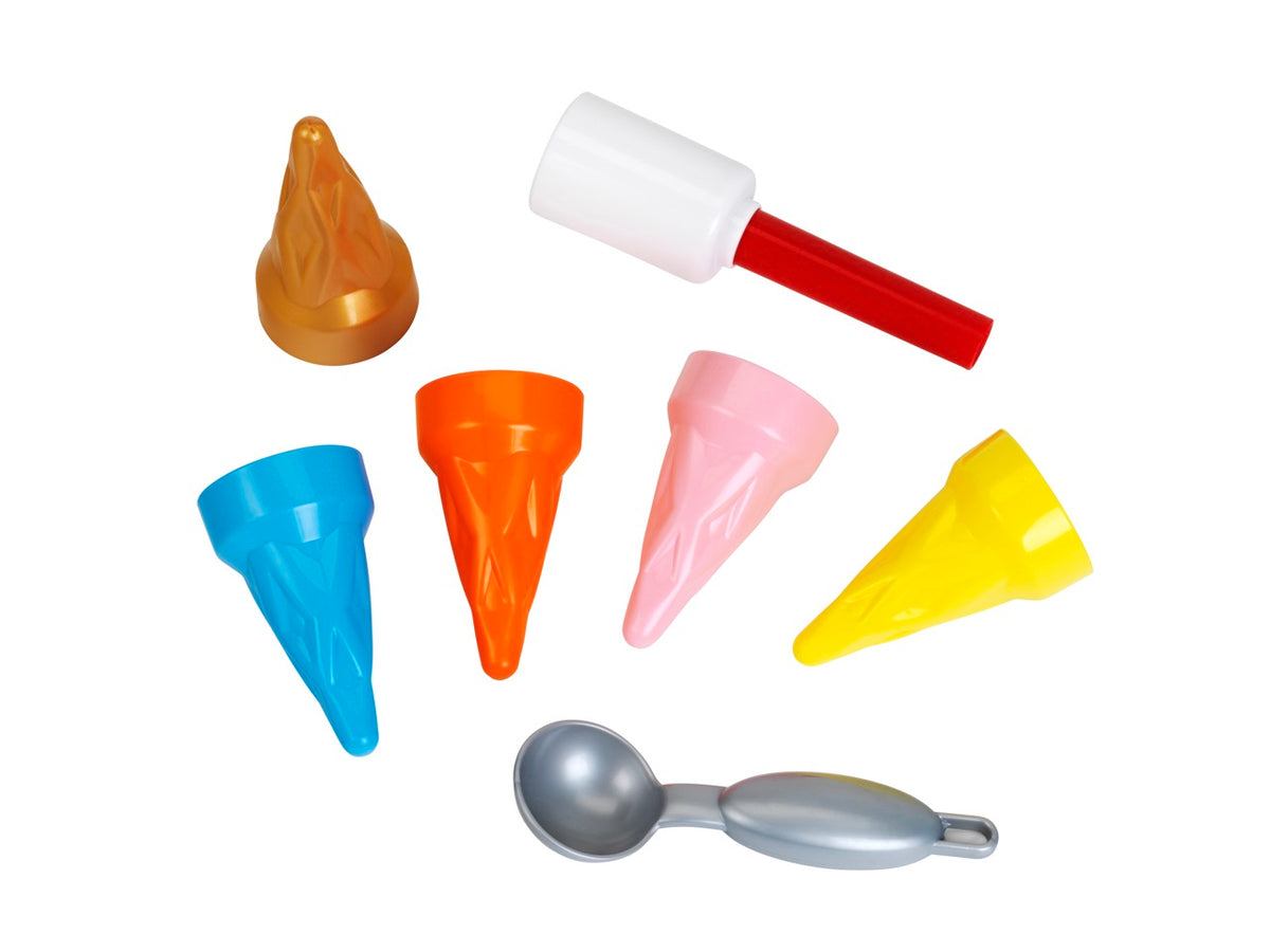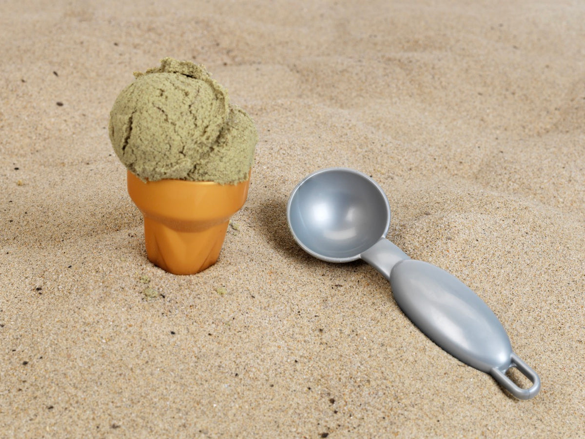 Sada zmrzlinového písku obsahuje pět barevných kornoutů na zmrzlinu, špachtli na zmrzlinu a naběračku na zmrzlinu.