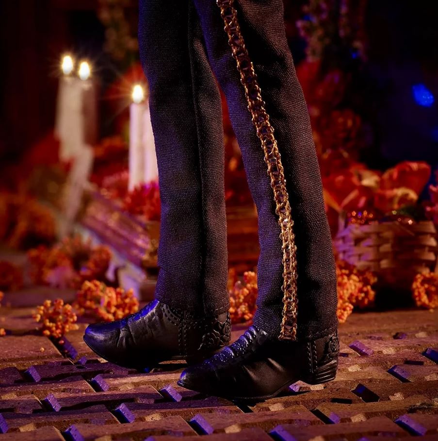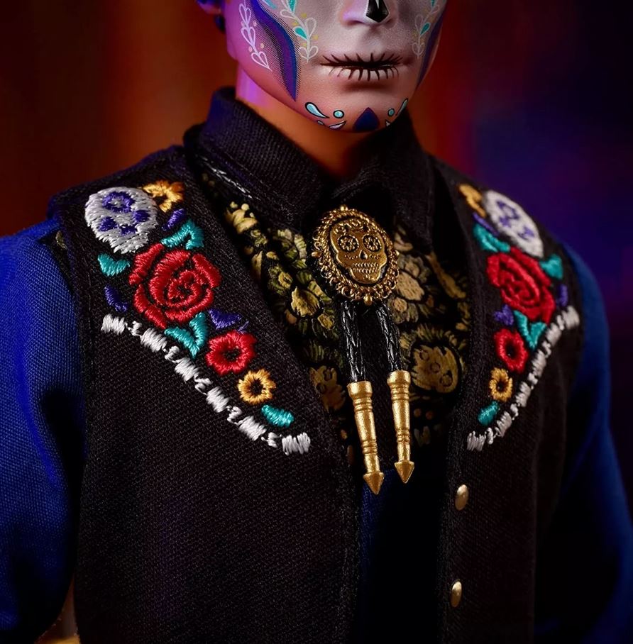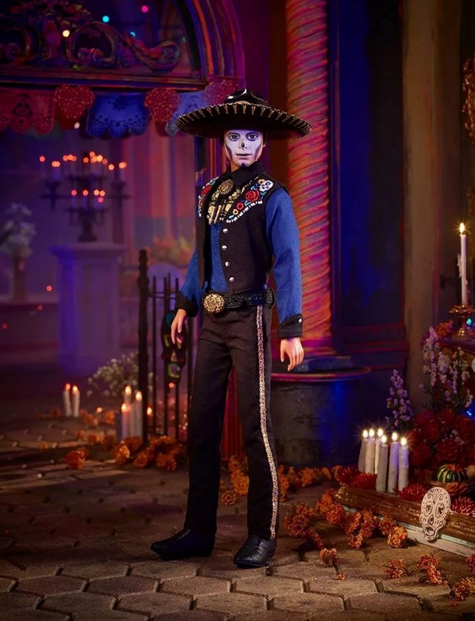 Panenka je ideální pro sběratele a ideální jako dárek. Vyznačuje se mimořádným smyslem pro detail. Panenka Ken ve stylu Charro má na sobě modrou košili a tílku a zdobí ji lesklé lebky a květinové doplňky. Jeho outfit krásně doplňuje kravata se vzorem lebky a sombrero se zlatou stuhou. Obal je vhodný k vystavení.