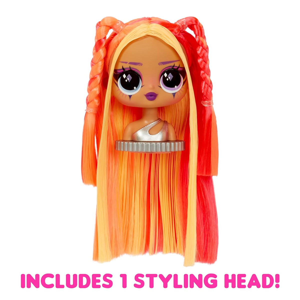 Změňte Baileyin vzhled během okamžiku tím, že vyměníte její modré, fialové a růžové vlasy za neonově purpurovou a oranžovou stylizovanou čelenku, kterou lze snadno připevnit k tělu panenky.