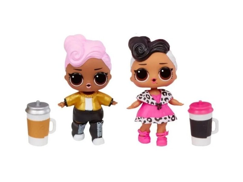 Panenka LOL Surprise má jasně růžové vlasy, bílé tričko, zlatou bundu, černé šortky a vysoké černé tenisky. Dokonale ladí se svou starší sestrou.