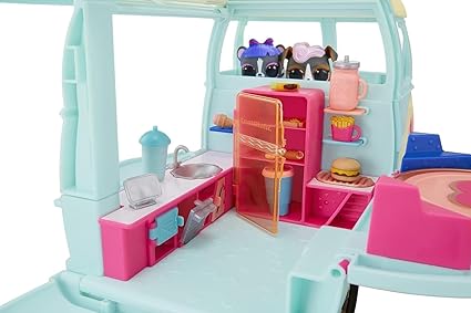Rozbalte další překvapení včetně nápojů, hraček na jídlo, točícího se tanečního parketu, vlajek, pokladny, archu samolepek a dalších! Chcete-li zahájit transformaci obytného přívěsu, posuňte zadní dveře dolů, zvedněte střechu a zatáhněte za menu; pak otevřete oboje dvířka a odkryjte okénko a připravte se ke grilování.