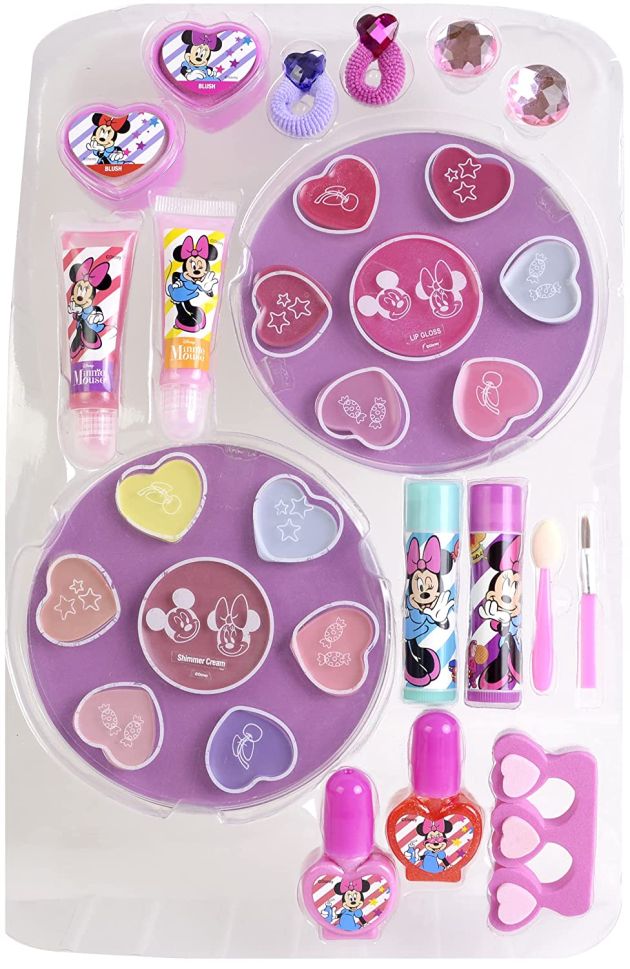 Batoh Super Minnie Mouse, 30 cm vysoký a 19,5 cm široký. Obsahuje plnohodnotnou kosmetiku: 2 tvářenky, 2 třpytky, 2 spony do vlasů, 2 křišťálové prsteny, paletka se 7 třpytkami, paletka s krémovými očními stíny, 2 rtěnky, 2 třpytivé laky na nehty (červený a růžový), separátor, aplikátor, štěteček.