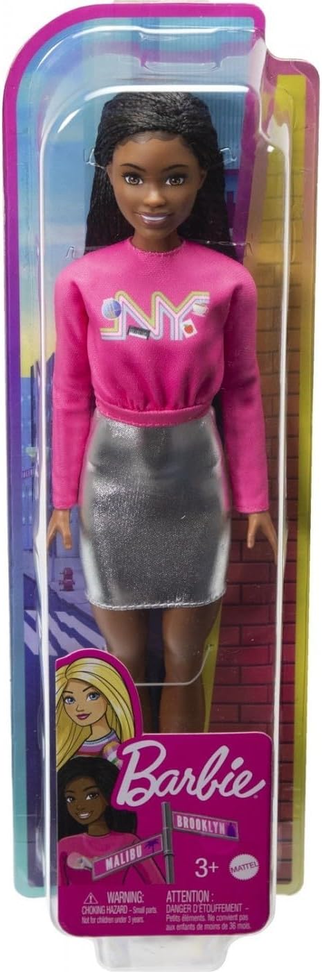 - Panenka Barbie® 'Brooklyn' Roberts vypadá stejně jako její postava na obrazovce, má na sobě růžové tričko s NYC grafikou a trendy stříbrnou metalickou sukni.