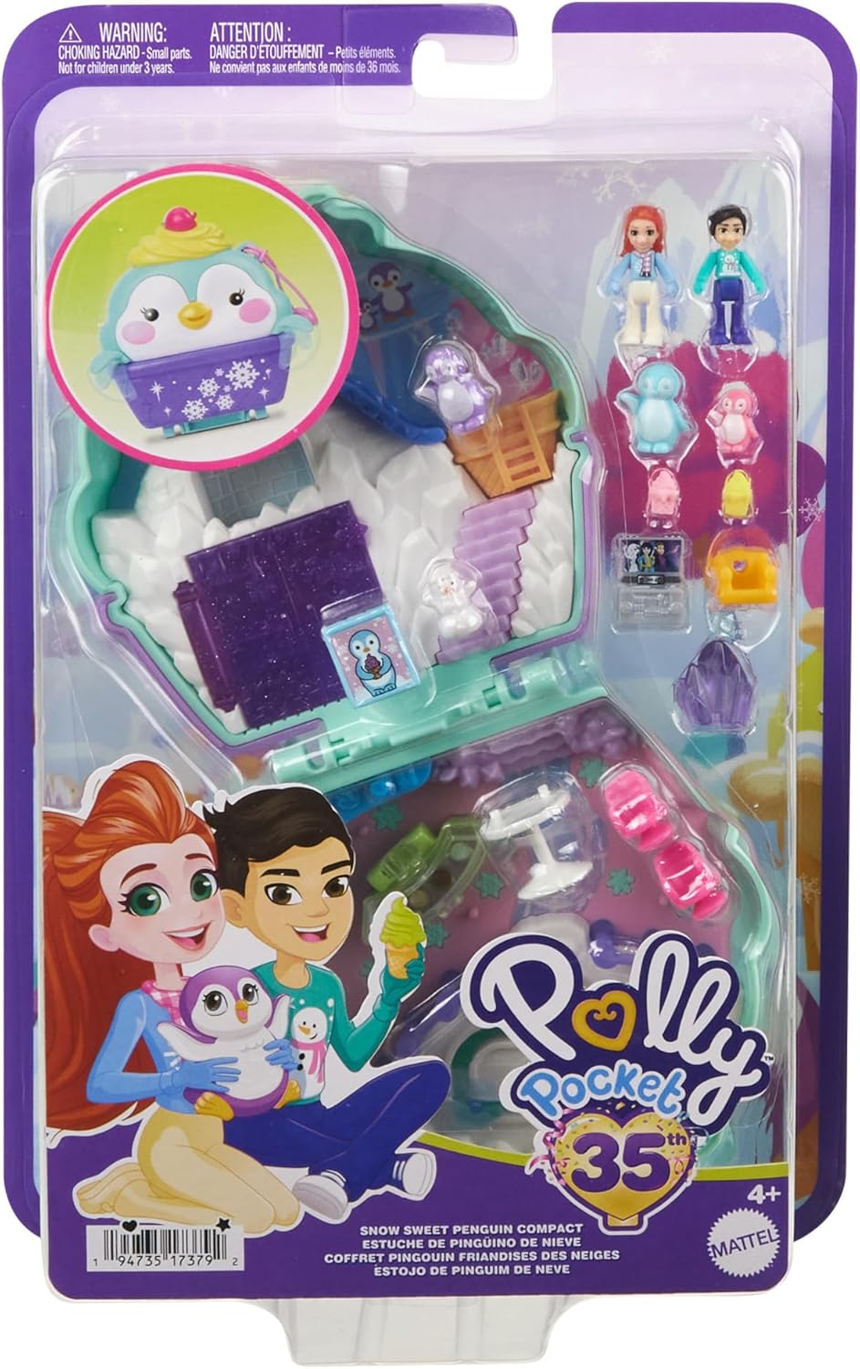 Tento Polly Pocket Snow Sweet Penguin Compact obsahuje dvě mikropanenky, 13 doplňků a 6 funkcí pro vyprávění pro dokonalé zimní dobrodružství!