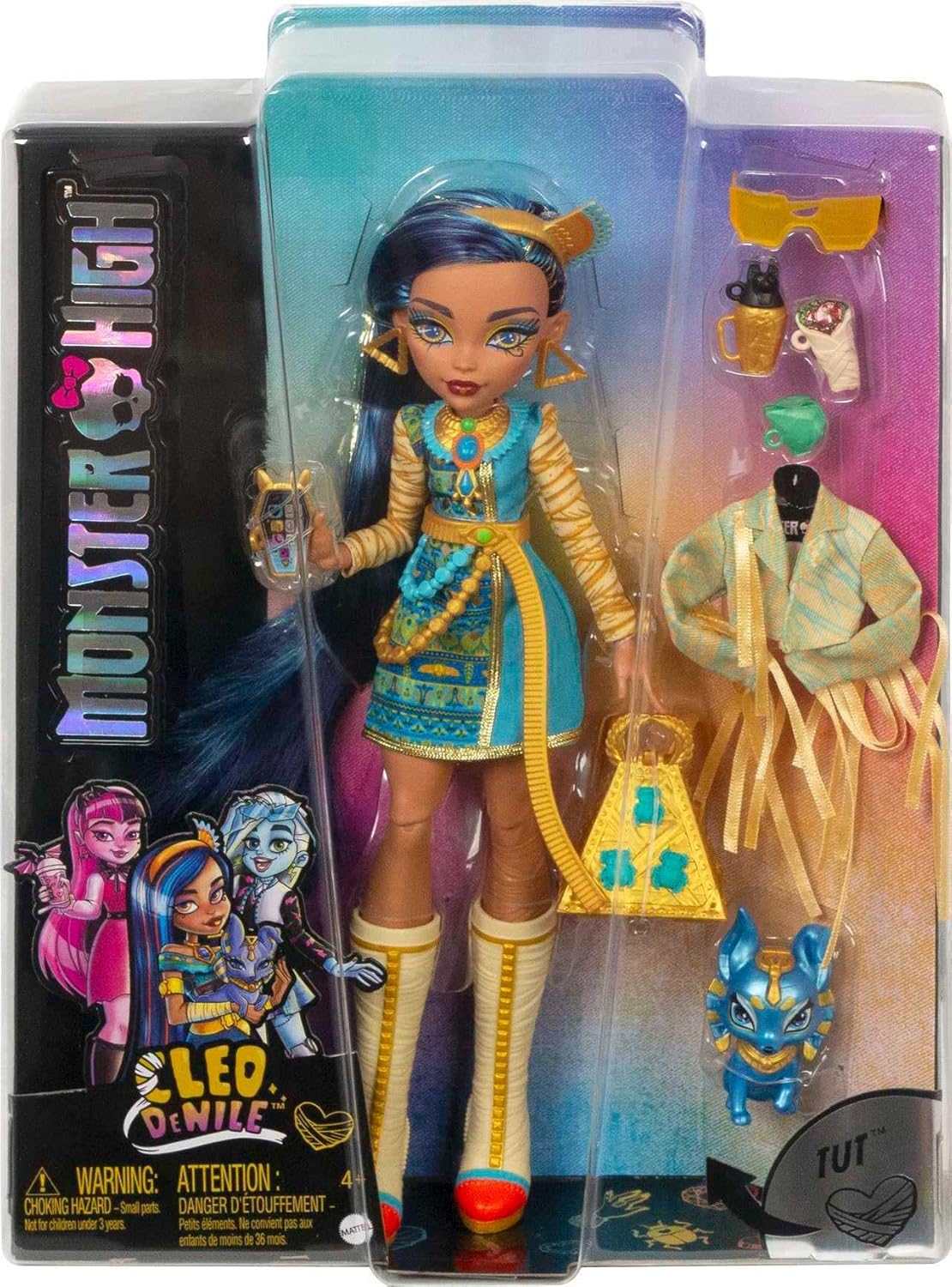 - Škola začala a duchové Monster High™ se objevují v křiklavém stylu! Panenka Cleo De Nile™ chodí po chodbách Monster High™ v módě inspirované její královskou šarvátkou. Má na sobě královsky modré šaty s rukávy inspirovanými mumiemi a nádherným řetízkovým páskem. Její děsivě elegantní vzhled dotvářejí vysoké boty, batoh ve tvaru pyramidy zdobený skaraby a okouzlující zlaté doplňky.