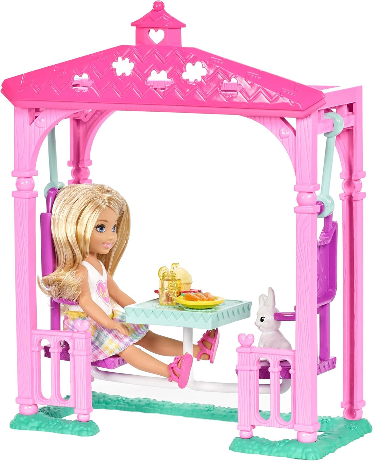 Panenka Chelsea a její roztomilý zajíček si mohou užívat styl houpání v tomto piknikovém pavilonu vhodném pro domácí mazlíčky. Má stůl a dvě židle, které zároveň slouží jako houpačky – akci spustíte pouhým stisknutím!