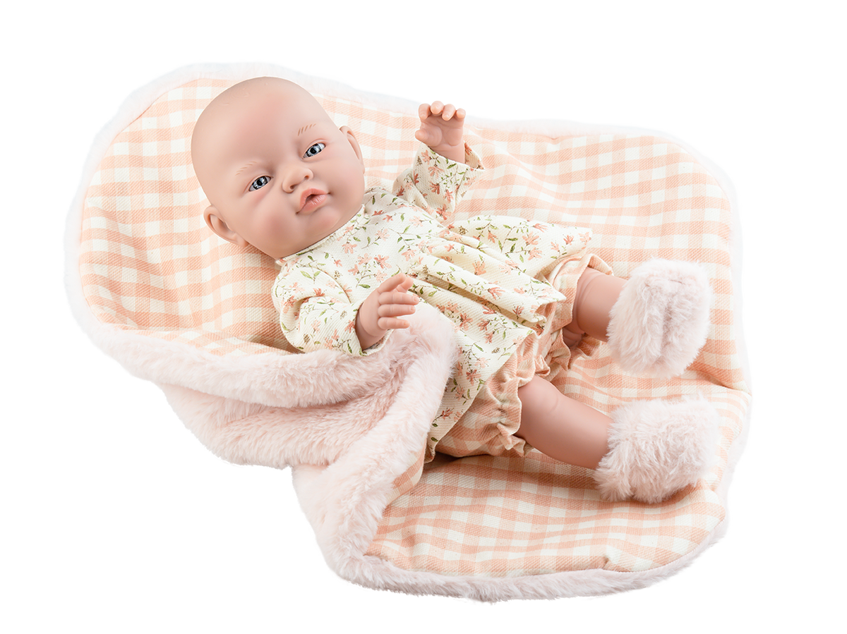 - Materiál, ze kterého je vyroben, má jemnější omak a vůni, aby více připomínal miminko. Má na sobě květinové šaty a nadýchané kalhotky. Součástí je i její kostkovaná a nadýchaná deka.
