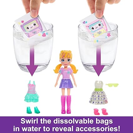 - Děti mohou objevit tematická překvapení, jako je 3palcová panenka Polly Pocket do skříňky, papírový balíček, který se rozpustí ve vodě a odhalí doplňky, a exkluzivní kukla pro panenku Polly!