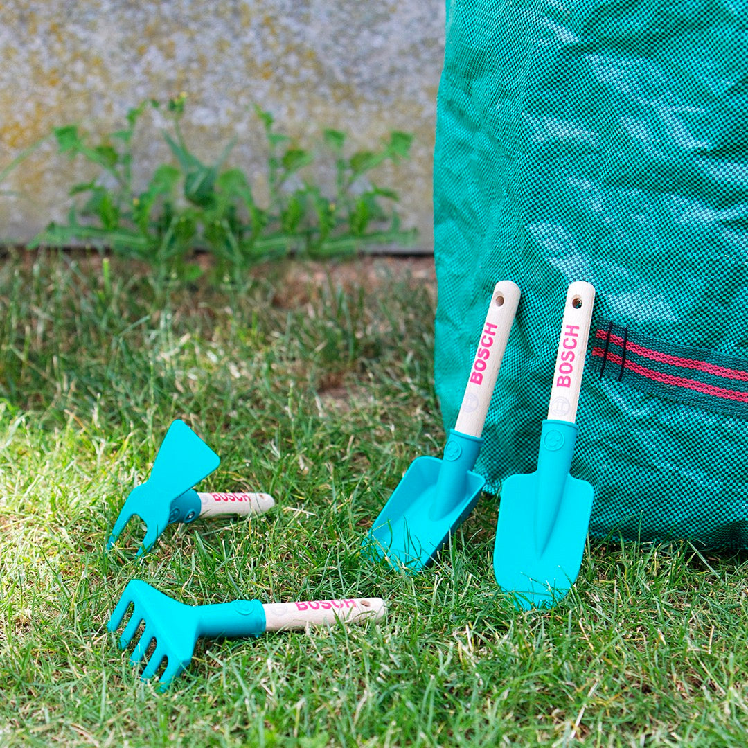 Zahradní sada pro děti obsahuje odolné nářadí na hraní v oblíbeném designu Bosch: lopatu, hrábě, rýč a motyku. Zvláště praktické je předvrtané poutko pro zavěšení zahradního nářadí.