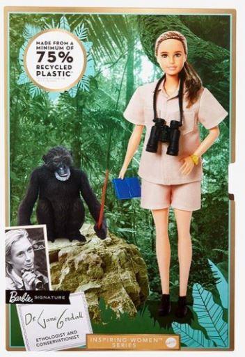Série Barbie Inspiring Women oceňuje neuvěřitelné hrdinky své doby: odvážné ženy, které riskovaly, změnily pravidla a připravily generacím dívek cestu k ještě větším snům. Na počest desetiletí oddanosti, průkopnického výzkumu a hrdinských úspěchů jako ochránkyně životního prostředí, chování zvířat a aktivista věnuje Barbie speciální sběratelskou panenku Dr. Jane Goodallová, DBE, zakladatelka Institutu Jane Goodallové a Posla míru Organizace spojených národů. Panenka je vyrobena z recyklovaného plastu. Spolu s opičkou Davidem Greybeardem, panenkou Barbie Dr. Jane Goodallová má na sobě polní oblečení a je vybavena dalekohledem a notebookem.