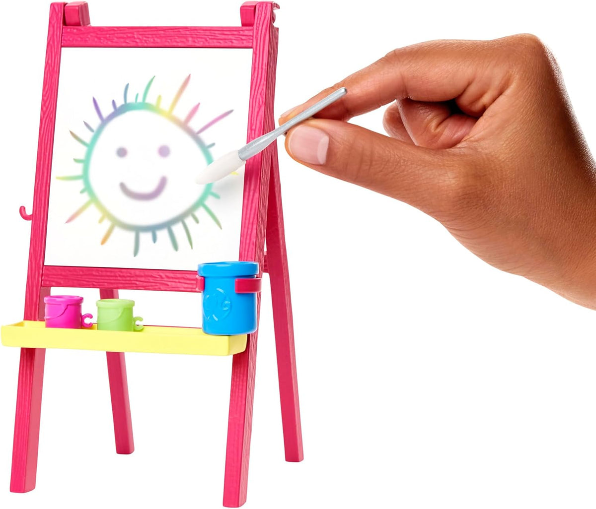 Učitelka Barbie umění ukazuje své studentce, jak malovat na stojanu s překvapením, které mění barvu: ponořte štětec (součástí balení) do vody, malujte na prázdný povrch a magicky se objeví obrázek! Vytvářejte znovu a znovu otíráním povrchu. Barbie je oblečená v legínách, tričku, teniskách a roztomilé džínové zástěře, připravená učit svou zvědavou studentku, která má na sobě roztomilé šaty a batůžek. Mezi herní doplňky patří stojan s malířskou plochou, nádoby na barvy a vodu, paleta, štětec a stolička pro studenta.