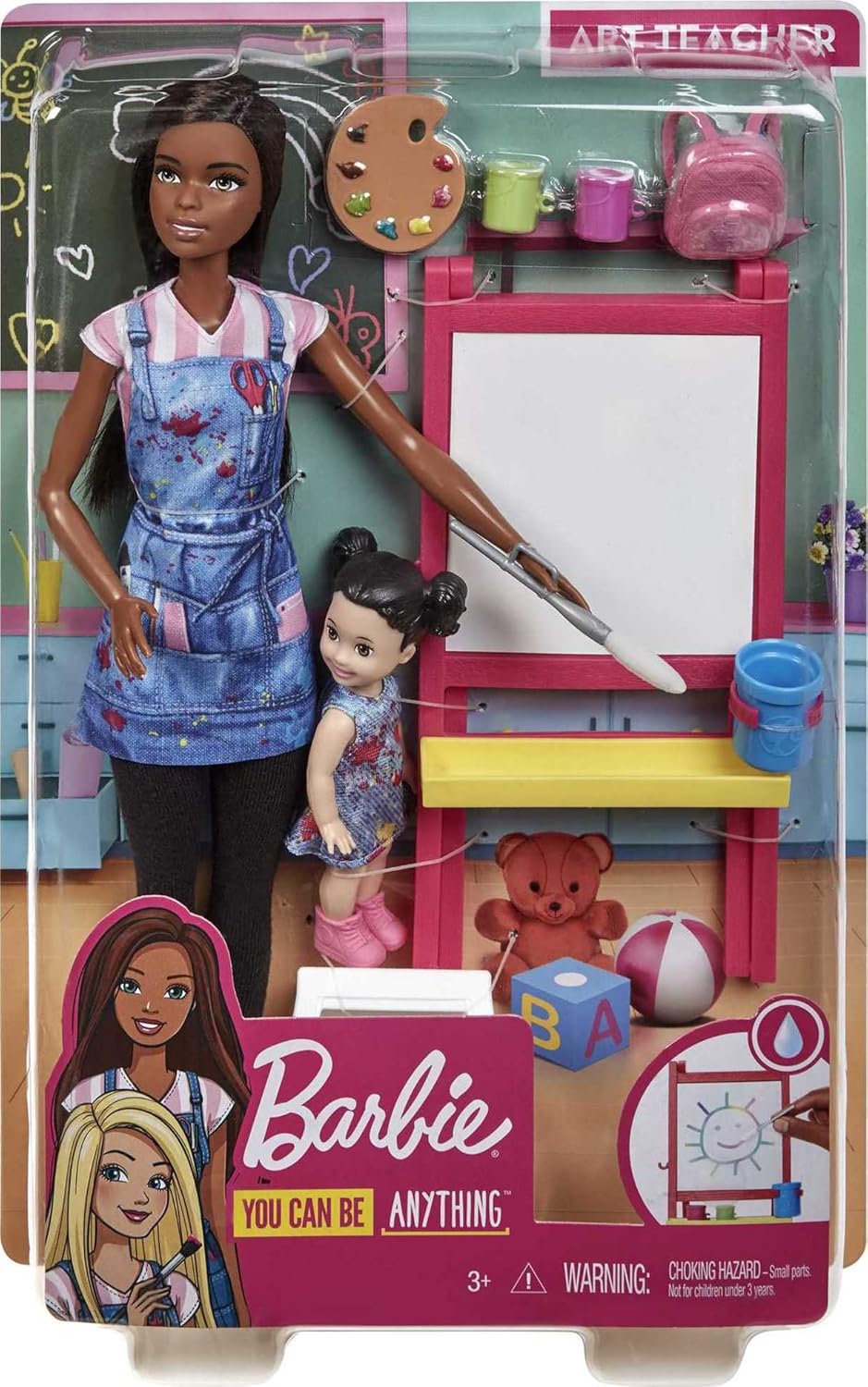 Cena za jednotku ProUčitelka Barbie umění ukazuje své studentce, jak malovat na stojanu s překvapením, které mění barvu: ponořte štětec (součástí balení) do vody, malujte na prázdný povrch a magicky se objeví obrázek! Vytvářejte znovu a znovu otíráním povrchu. Barbie je oblečená v legínách, tričku, teniskách a roztomilé džínové zástěře, připravená učit svou zvědavou studentku, která má na sobě roztomilé šaty a batůžek. Mezi herní doplňky patří stojan s malířskou plochou, nádoby na barvy a vodu, paleta, štětec a stolička pro studenta.